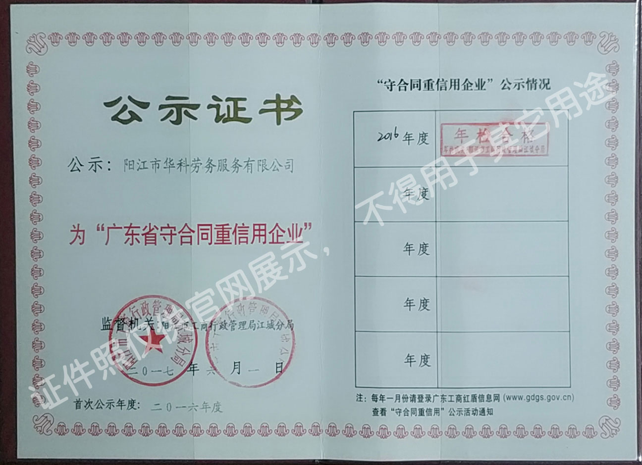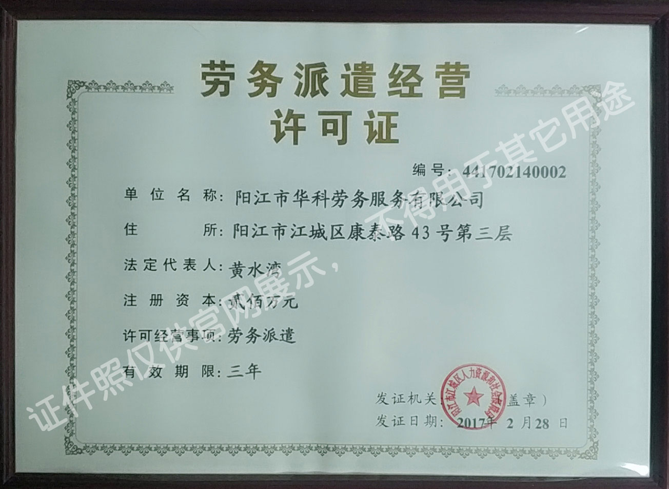 華科勞務(wù)服務(wù)有限公司是專業(yè)從事人事代理、勞務(wù)租賃、人力派遣及管理的綜合性服務(wù)機(jī)構(gòu),是首批獲得廣東省人力資源廳、陽江市勞動(dòng)和社會(huì)保障局頒發(fā)人力資源許可證的合法單位。公司秉承“誠信務(wù)實(shí)、專業(yè)熱情、滿意第一、服務(wù)社群”的經(jīng)營理念,在勞務(wù)派遣業(yè)務(wù)的基礎(chǔ)上,更致力于合同制工人(臨時(shí)工、實(shí)習(xí)生、假期工)方向發(fā)展,為用工企業(yè)及時(shí)輸送合格的各類人才,合理調(diào)配人力資源的有序流動(dòng),幫助求職者尋求更加滿意的就業(yè)渠道和崗位,切實(shí)維護(hù)求職者的合法權(quán)益。
